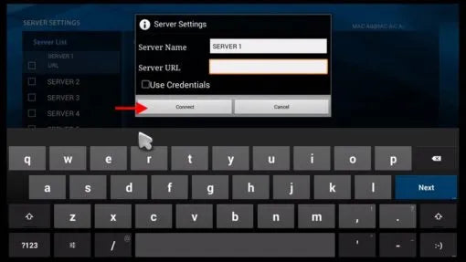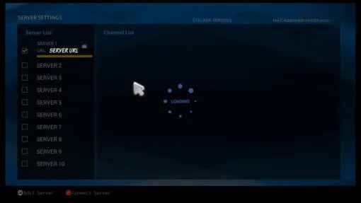 Étape 4 : Dans le champ « Nom du serveur », saisissez un nom (vous pouvez le choisir). Dans le champ « URL du serveur », saisissez l'adresse du portail (disponible auprès de votre fournisseur IPTV), puis cliquez sur « Connecter ». L'adresse MAC de votre appareil doit être enregistrée sur le serveur du fournisseur IPTV. Lors de votre commande, indiquez votre adresse MAC dans le formulaire de commande si vous souhaitez utiliser cette méthode d'installation. Sinon, suivez la méthode 2.